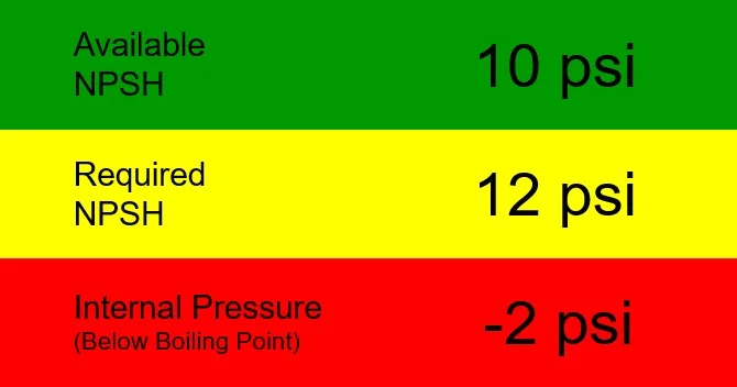 Now let’s say we want to trim cost, so we consider a smaller pump. It has a higher required NPSH (NPSHR) because, all other things being equal, smaller pumps always have higher NPSHR for a given operating point than larger pumps. In this case, our required NPSH is 12 psi. That leaves us with a negative internal pressure of -2 psi. That’s trouble because we know we have to remain above 0 psi to eliminate any chance for cavitation. If our water is 212°F, cavitation is inevitable. Better look for another pump – or replace the one that was misapplied on the existing system.
