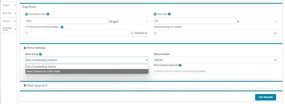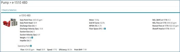 The selection software must also be used to determine power requirements (and impeller trim) when fluids other than water are used. In Figure 5, we have chosen a 50% ethylene glycol solution for our 430 gpm at 54 feet requirement.