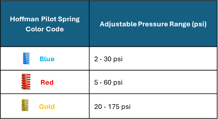The controlled downstream pressure range is determined entirely by the pilot spring. Hoffman uses colors to indicate the pressure setpoint ranges for their spring pilots.